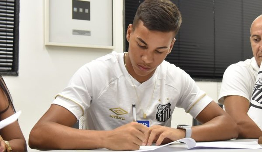 Depois de longos meses de negociações, Kaio Jorge assinou seu primeiro contrato profissional com o Santos. O vínculo é válido até 2022, e o Peixe manteve 100% dos direitos econômicos do garoto. A multa rescisória é de 50 milhões de euros (R$ 213 milhões).